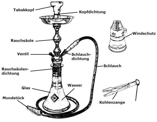 verziertes Wassergefäß, auf das man eine Rauchsäule aus Chrom oder Messing steckt. An dieser wird meist seitlich ein Schlauch mit Mundstück gesteckt. Die Mundstücke gibt als in gerader Forum und etwas gekrümmter. Oben kommt dann ein Kopf aus Ton oder Keramik, der 1 bis 6 Löchern hat. Der ägyptische Tabak ist sehr feucht und meist aromatisiert. Er wird in den Kopf gedrückt und in der Regel mit Alufolie abgedeckt. Zum Schluß wird ein Stück glühende Holzkohle darauf gelegt. Zieht man an dem Mundstück, verbrennt der Tabak nicht wirklich, er wird nur erwärmt, er wird also nicht wirklich "geraucht". Deshalb sagt man auch sagen: Komm lass uns eine Shisha "trinkten". Shischataback gibt es in vielen Geschmacksrichtungen wie: Apfel (Doppelapfel), Melone, Schoco, usw..