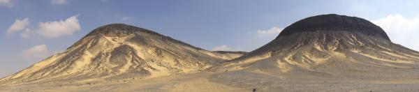 Die Schwarze Wüste, ein unglaublicher Anblick. Schwarzes Vukangestein - gepaart mit goldfarbenen Wüstensand. Die Schwarze Wüste liegt nördlich der Weißen Wüste, und ist über die Fernverkehrsstraße von el-Bawiti nach el-Farāfra erreichen. Sie dehnt sich zu beiden Seiten der Straße aus.