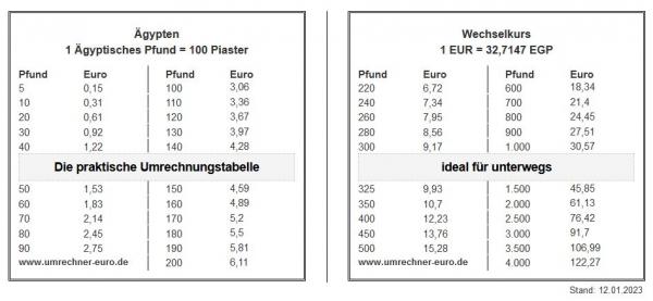 16.12.2022 - Heute gab es für einen € mehr als 26 LE - in Ägypten "blüht" der Schwarzmarkt - auf dem man inzwischen für einen € 35 LE bekommt.